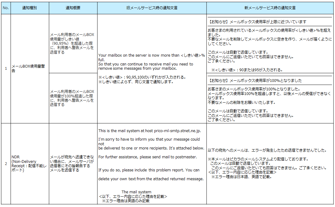 メールサービス移行に伴い、メール利用者への通知メール文言が日本語表記に変更となります。