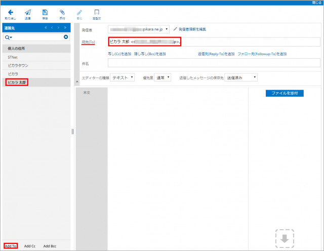 相手を選択し、連絡先の一番下の「Add To」をクリックするか、もしくは相手の名前をダブルクリックすると、「宛先(To)」に相手の情報が呼び出されます。