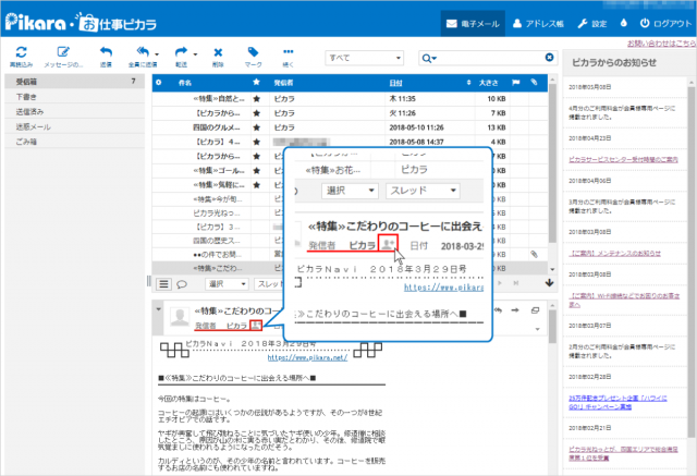 本文の見かたを参考にしてメールの本文を表示させ、上部の「発信者 ピカラ」の右側のアイコン(人型+)をクリックします。