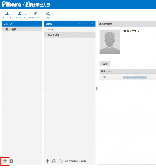 メールの作成画面で、左側の【個人の住所】をクリックし、【呼び出したいグループ】(例:ピカラ)をクリックします。