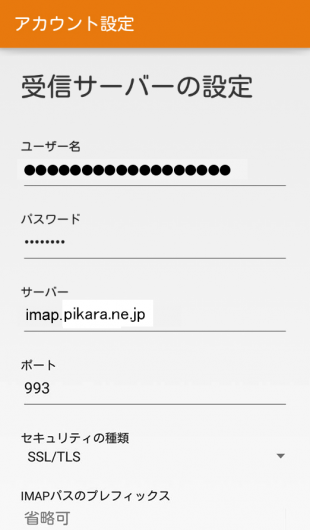 | IMAPサーバーまたはサーバー | imap.pikara.ne.jp |