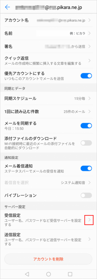 Android のメールではアカウント削除を行うと、