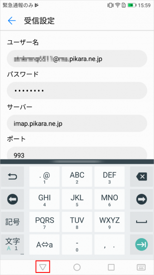 受信設定の画面で、【▽】をタップすると