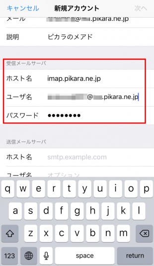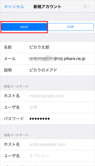 | ホスト名 | imap.pikara.ne.jp ※半角入力 |